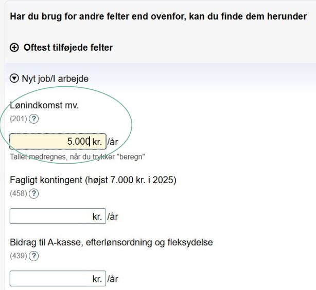 Udfyld felt 201 med lønindkomst mv. med det forventede årlige afkast. Indtast et beløb lavere end bundfradraget. Jeg har valgt 5.000 kr.
